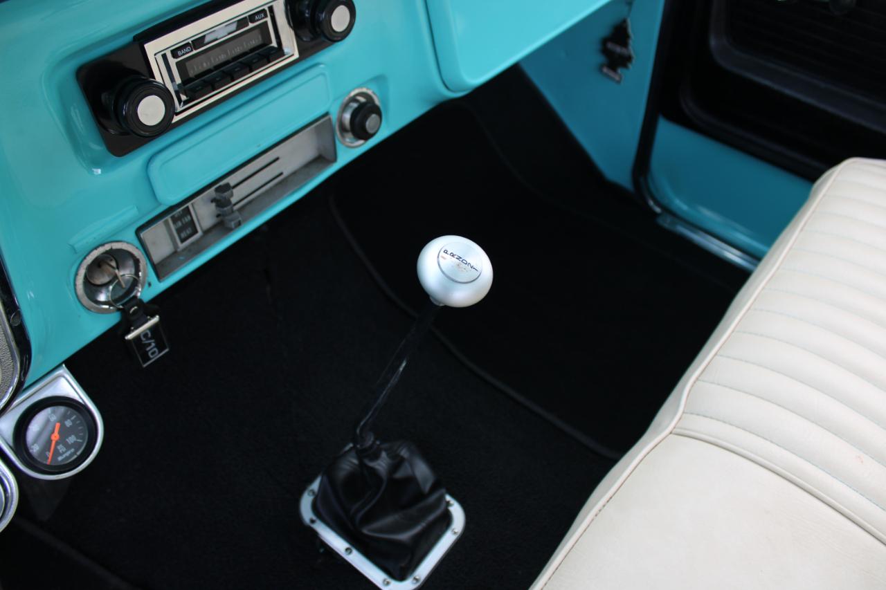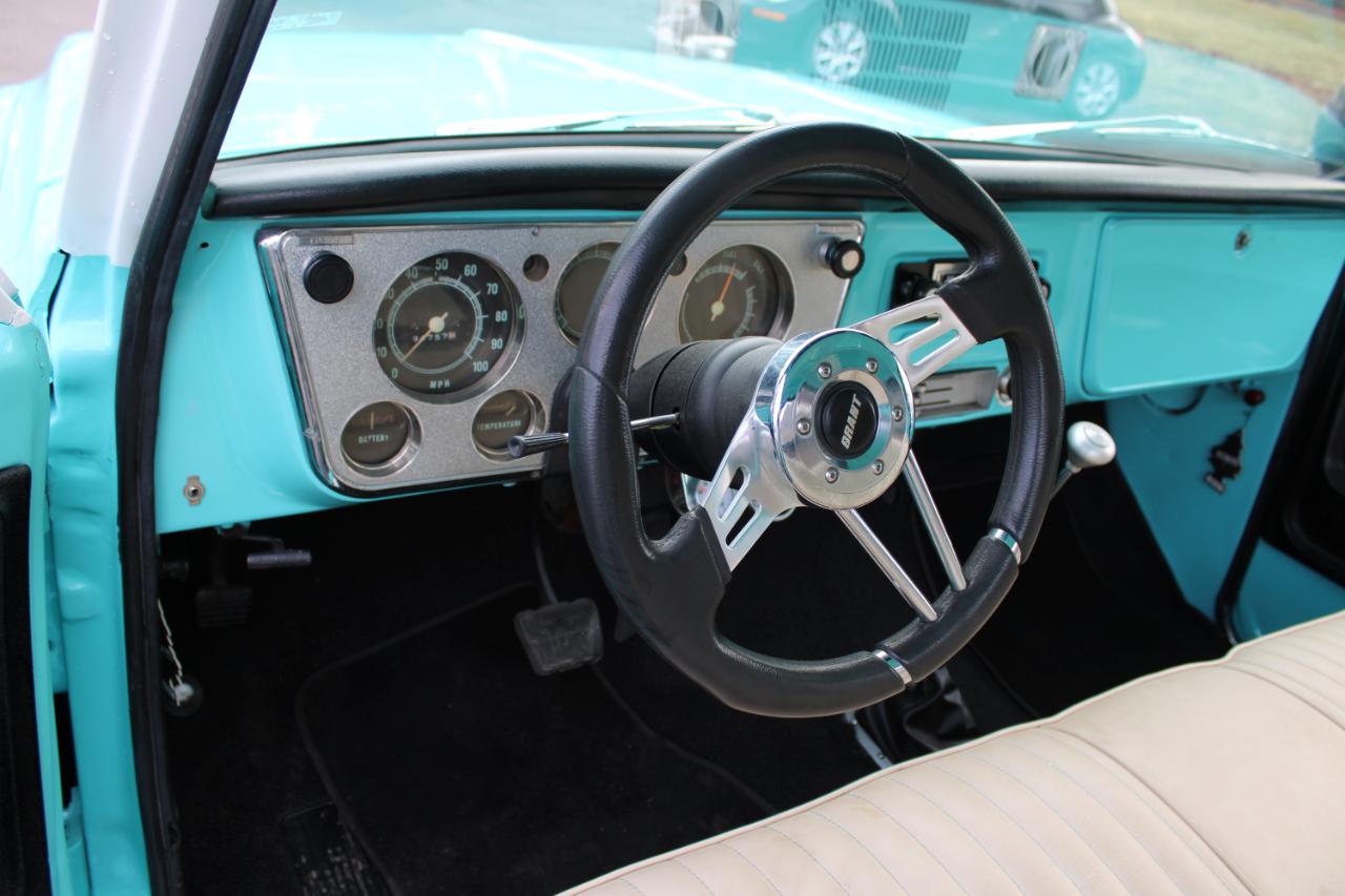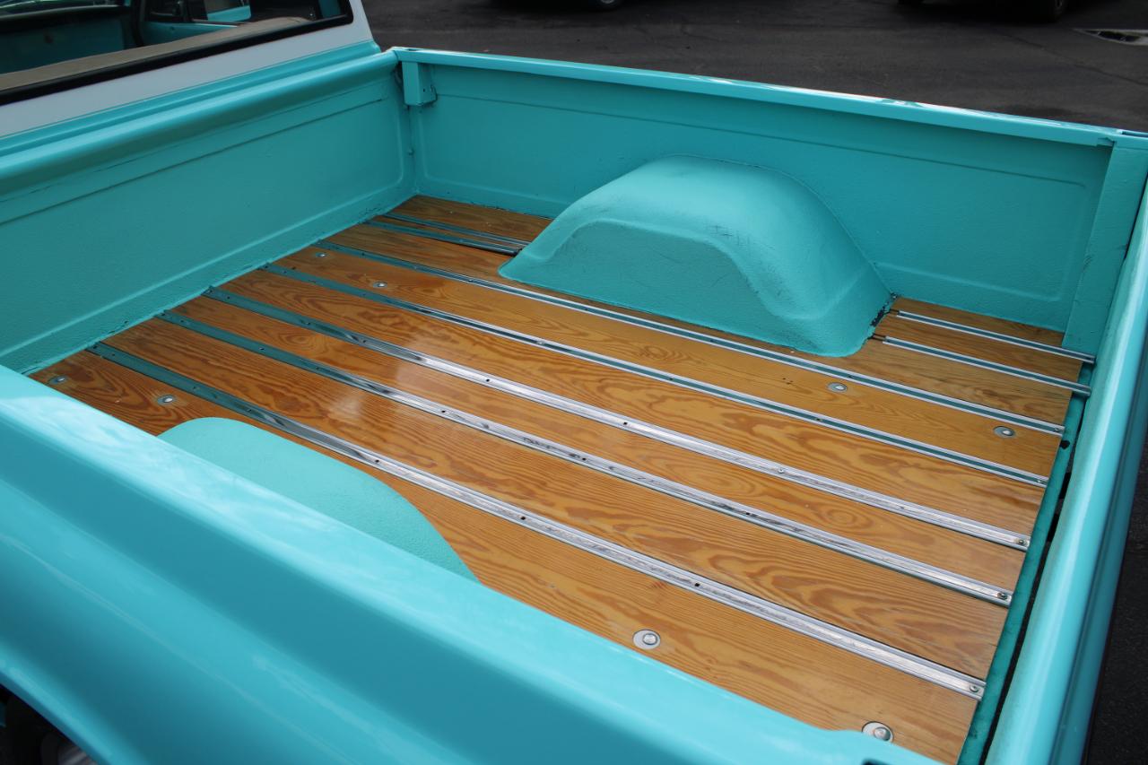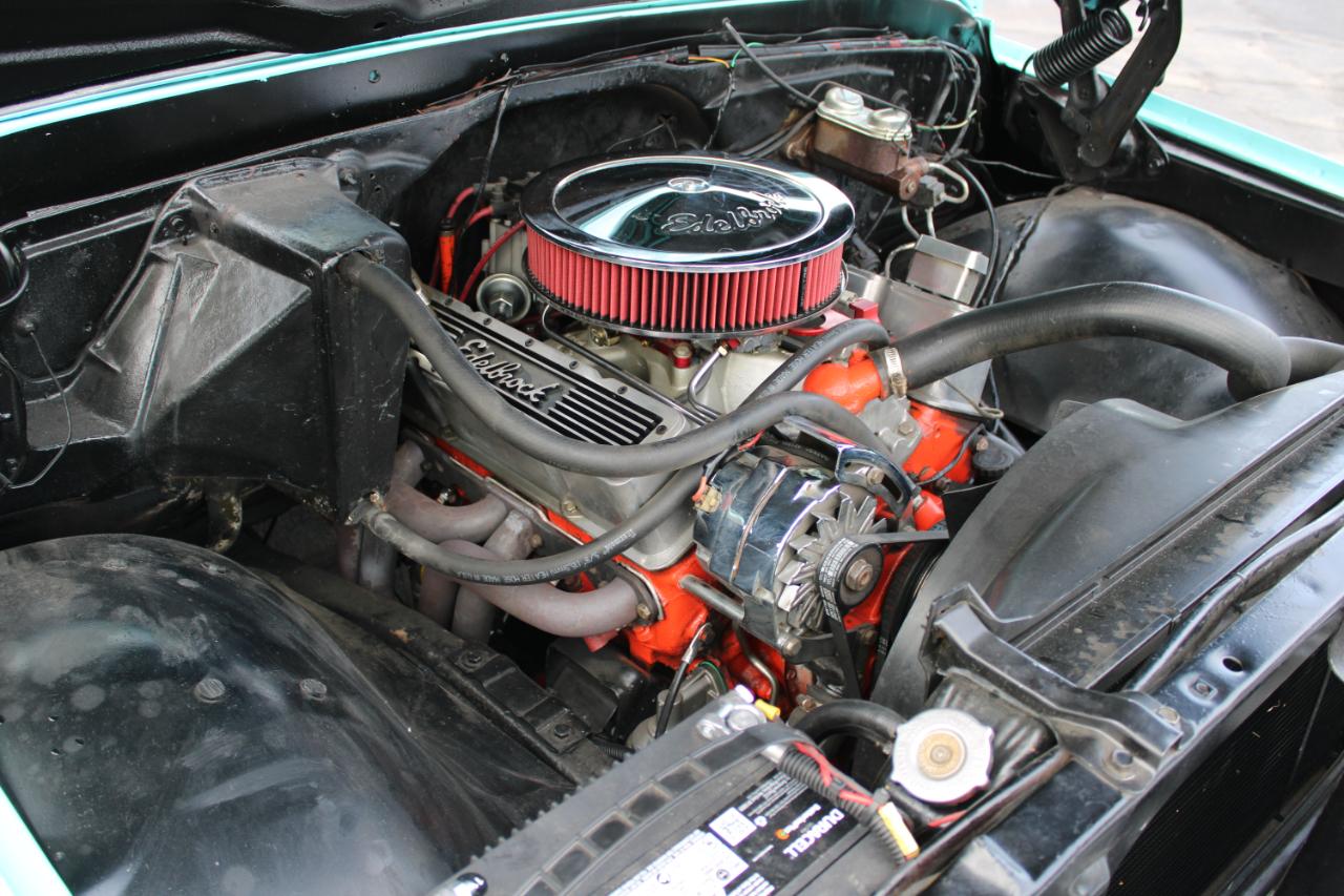 A 350 small block V8 with several engine mods, not sure of specific cam size etc as I did not build this truck, its a lumpy cam. And its a bear of a motor. Chrome and aluminum goodies throughout. Automatic transmission and a lowered stance on this REAR WHEEL DRIVE truck. Previously restored, no rust, no rot, no dents , paint is perfect and shines nicely. 20" wheels with good rubber, all new steering components and front disc brakes conversion. Interior is nice and this one is show worthy. New dual Exhaust just installed to quiet down what was to loud for us. Come check it out.